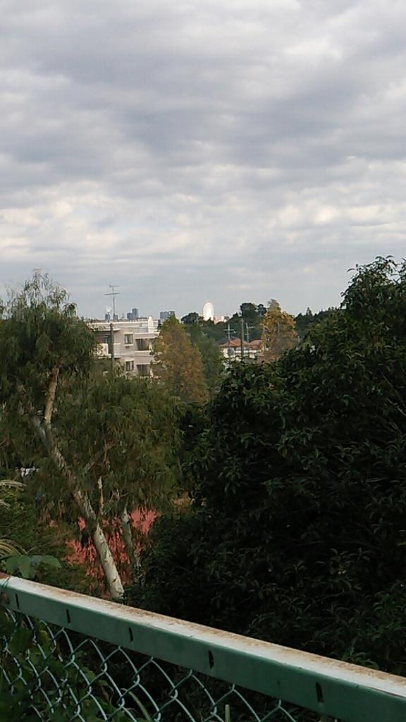 右折後の道も大きな新道ですが、歩道橋を先に見た手前で左の裏道に入ります。その先住宅街で道筋は良く判らないのですが、荏田高校の裏手で旧道が復活します。ここから尾根道のような所で遠くには観覧車も見えます。