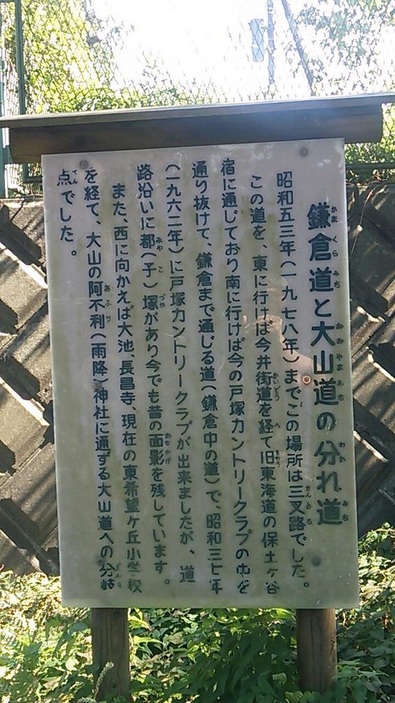 都塚の碑のところで旧道に戻り、ここには地蔵堂、道標も見られます。道路はこども自然公園の中を抜けるかたちで森の中を引き続き歩き、歩道橋を二つ潜った先左手に大山道との分岐の看板です。