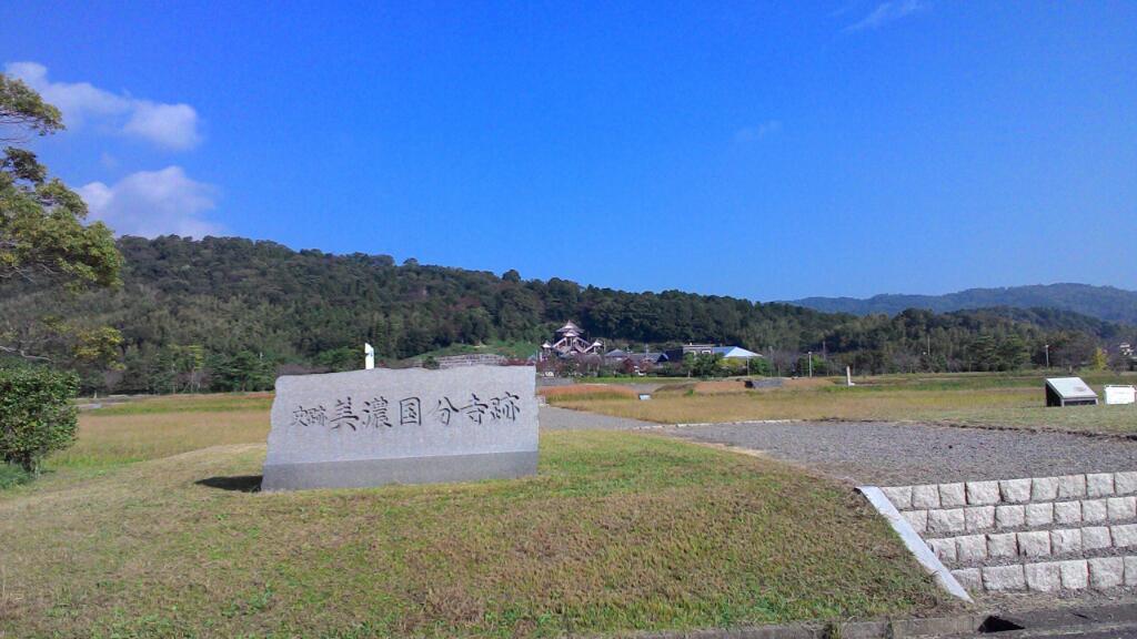 街道に戻り県道216号を渡ります。柿も実って秋を感じされる道ですが、国分寺道の道標で右手に寄り道です。先程の県道まで大きく戻るような感じで渡って、美濃国分寺の跡です。大きな国分寺跡の裏手には歴史民俗資料館や現国分寺なども有るのですが、見て回る時間もなくまた街道に戻ります。
