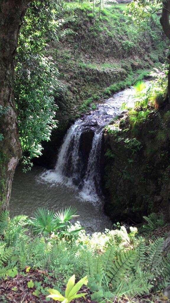 国道21号に戻りますが西首塚の先で左の裏道に入ります。この先左手に福島正則の陣跡です。再度国道21号と交差し、暫く行って右手に寄り道します。東海道線を踏切りで渡って山を登り、西軍の大谷吉隆(吉継)の陣跡です。ここから反対側の松尾山が遠望出来ます。松尾山は東軍に寝返った小早川秀秋の陣が有ったところで、小早川・大谷はこの間で戦ったという事になります。黒血川を渡り、新幹線手前の左側に鶯の滝(下写真)という小さな滝があります。