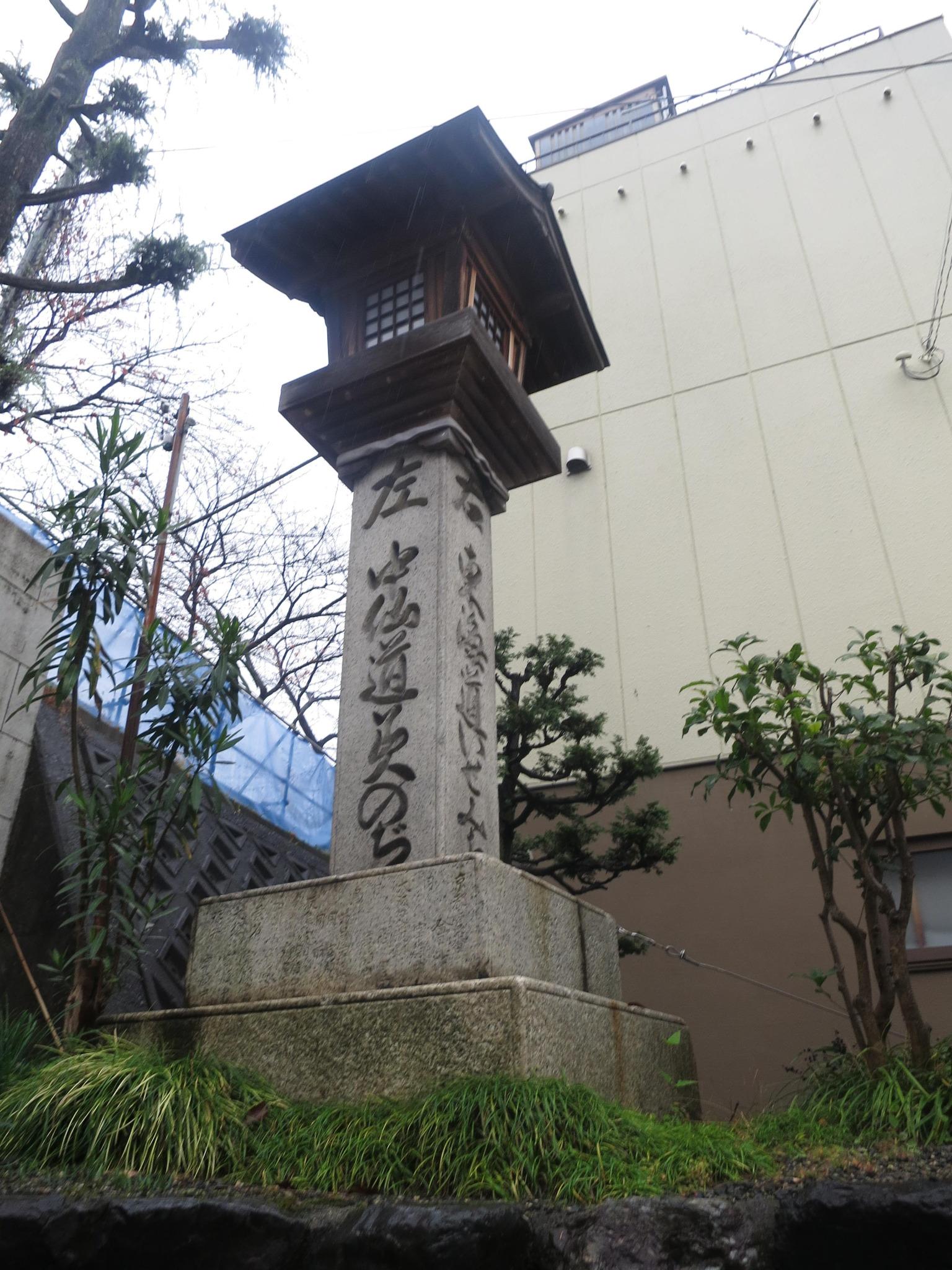 守山の名の興りとなった守山寺東門院です。明治天皇の御巡行では休憩所となった所でその碑も残っています。ところで雨は強くなり、この先草津の手前まで悩まされました。通勤の車なのか裏道でも通行はかなりあり、水たまりの水をはね返されるという状態が続き、一時は雷鳴も聞こえていました。