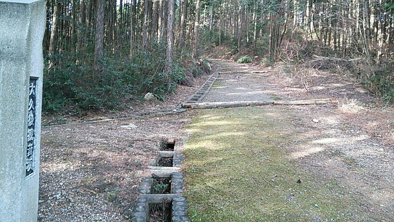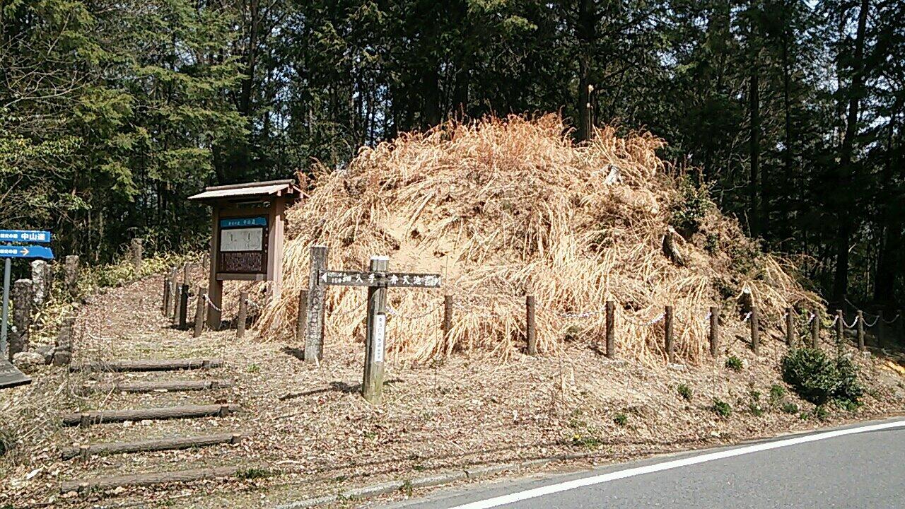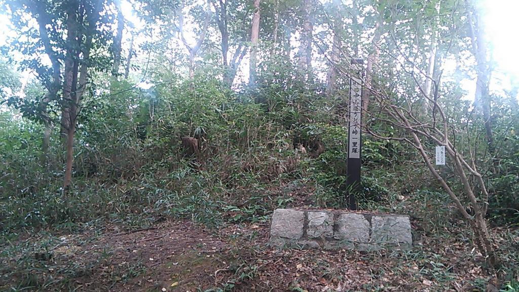 横断歩道で国道左側へ出て、ドライブイン等のあるところで階段を降りて国道下を潜り、うとう坂の登り口に出ます。うとう坂への道はハイキングコースといったところで、登り終えた先にうとう峠一里塚(下写真)です。ハイキングコースは終わり車道に戻ります。調整池を右手に見てから下り坂となり住宅地を抜けて行きます。
