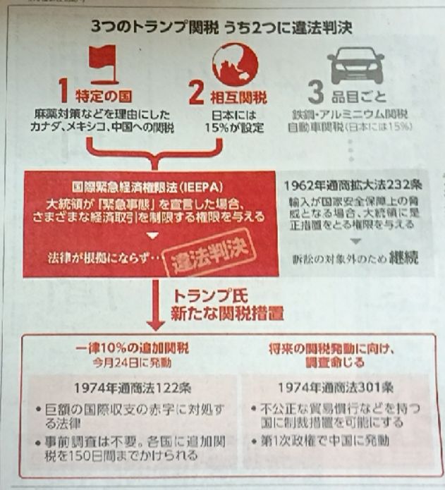 米国最高裁は一審、二審の違法判決を支持しトランプ関税を違法と判断した。これにより国際緊急経済権限法(IEEPA)を根拠として特定国に掛けた関税と相互関税が違法とされた。(朝日の解説図)